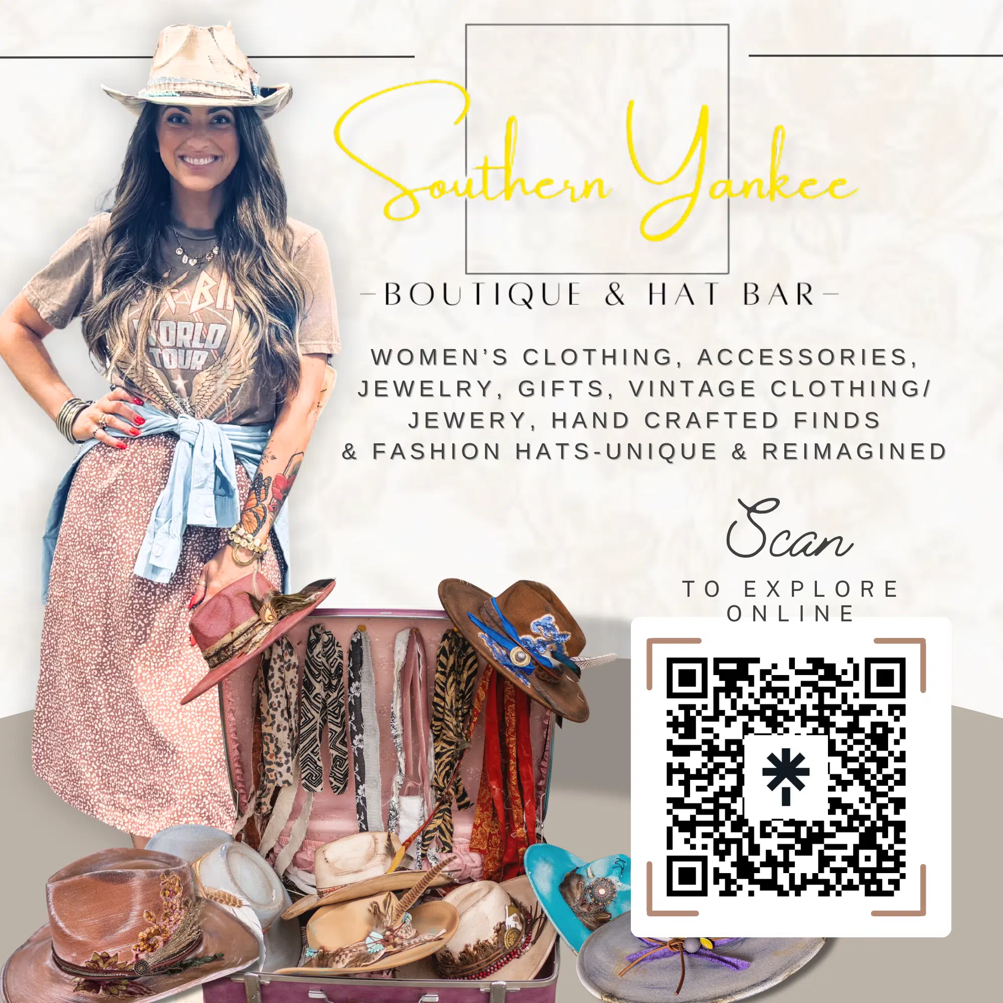 Where vintage soul meets modern style. Southern Yankee is your destination for women’s clothing, accessories, and one-of-a-kind treasures. Explore handcrafted, reimagined, show-stopping fashion hats—each piece thoughtfully designed and customized to make a statement.